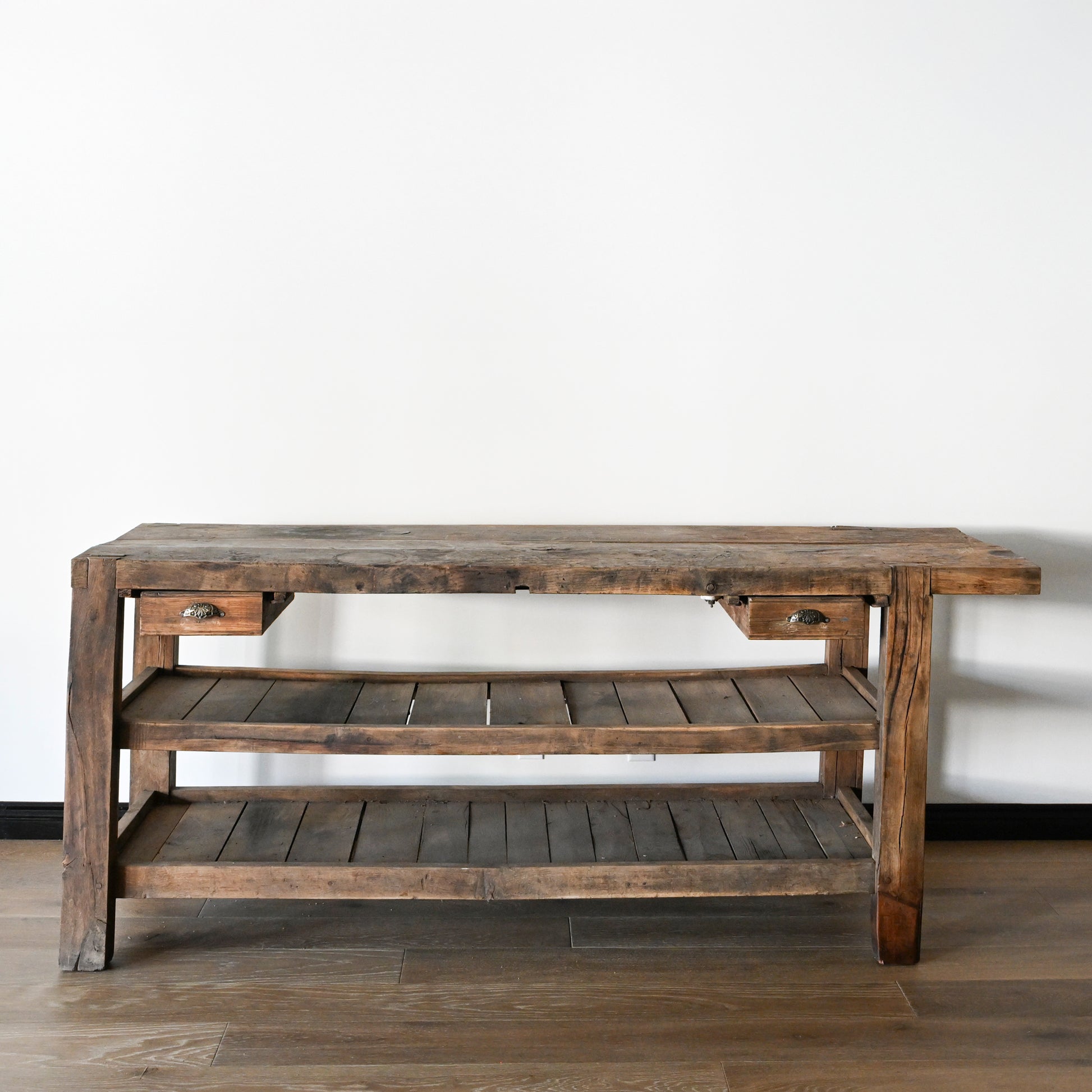 Robust French workbench from the early-to-mid 20th century, crafted from solid oak, exudes an authentic rustic charm that speaks to its utilitarian origins. Very heavy and generously scaled, it was originally designed as a workshop bench offering durability and practicality in equal measure. The thick top is worn to a beautiful natural patina, and the visible tool marks and aged wood grain lend the piece a warm, lived-in character. Two shallow drawers with metal pulls add functional storage, while the two-tiered open shelving below provides ample space for baskets, cookware, or display.